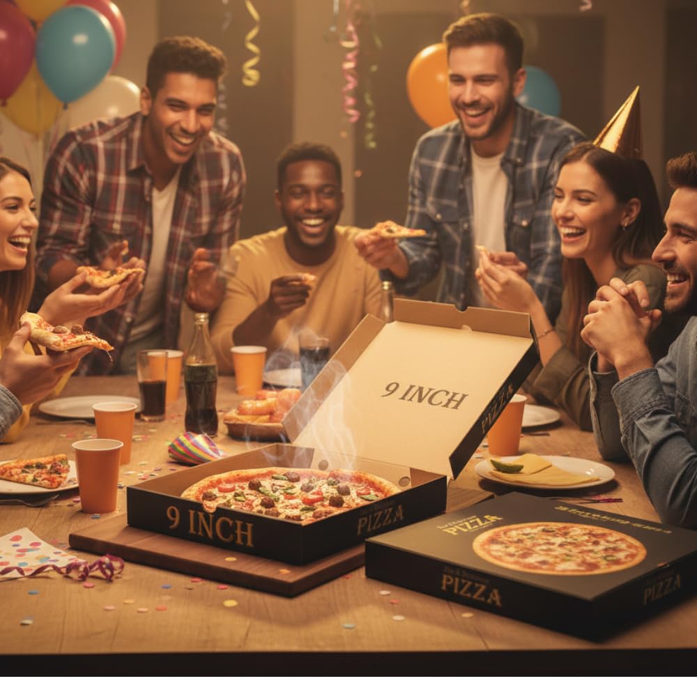 9 Inch Premium Printed Pizza Boxes, Durable 3-Ply Corrugated, Ideal for Takeaway, Delivery, and Home Parties, Food Grade