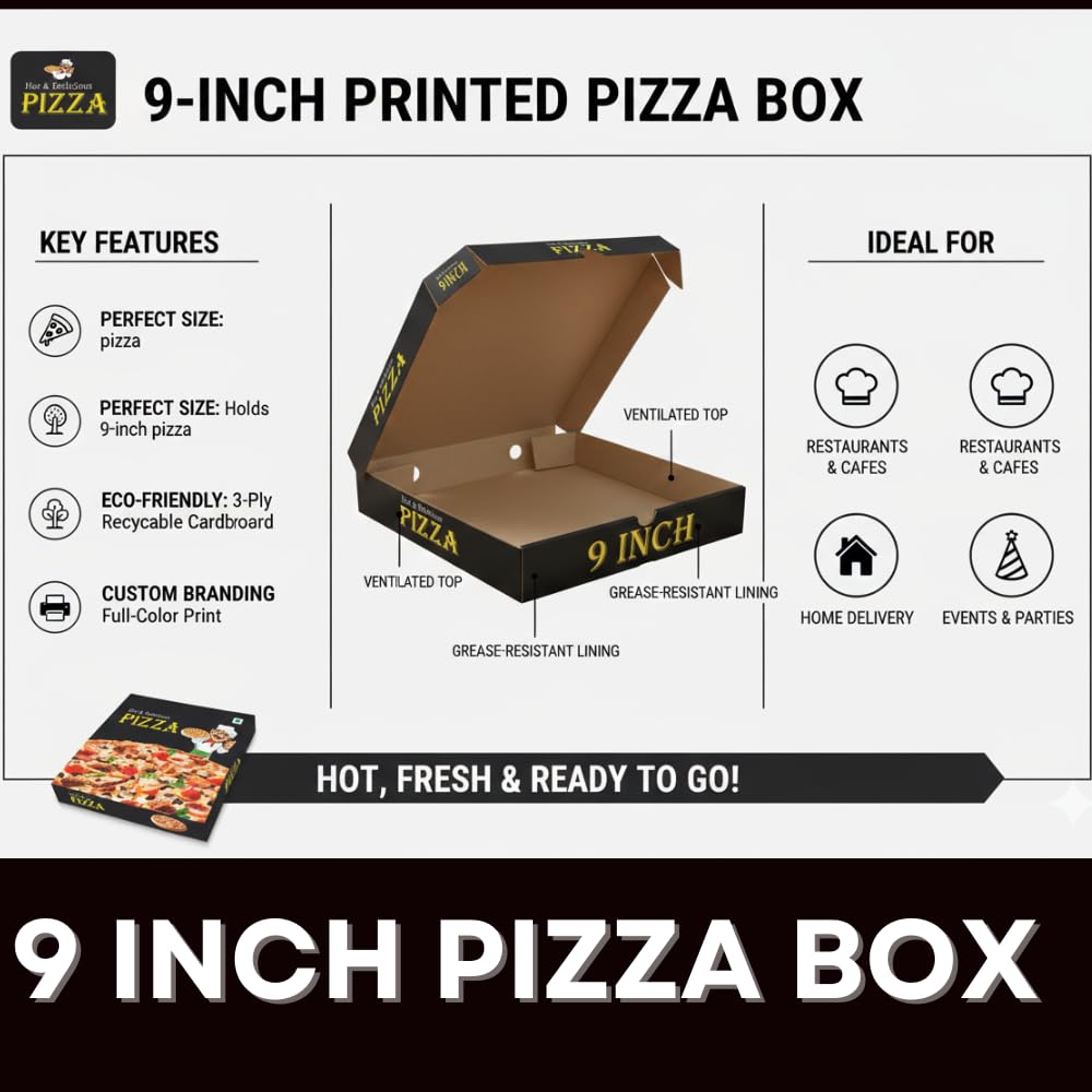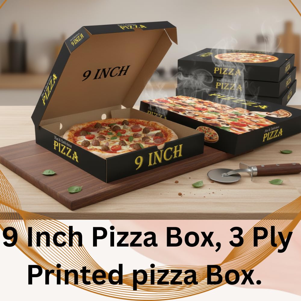 9 Inch Premium Printed Pizza Boxes, Durable 3-Ply Corrugated, Ideal for Takeaway, Delivery, and Home Parties, Food Grade